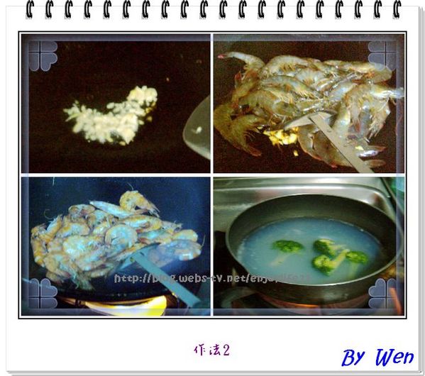 2。將蒜頭放入油鍋中爆香,先將蝦子炒熟,然後去殼放在一旁備用,花椰菜放入剛才煮蛤蜊的水中,川燙一下即可。