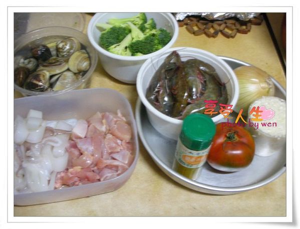 4。加入比米多兩倍的水入鍋中,放入蕃茄丁、擺上蝦、蛤蠣及花椰菜蓋上鍋蓋悶5分鐘