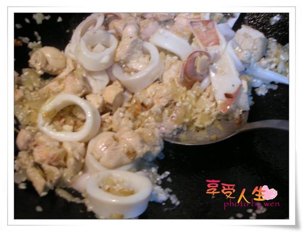 1。蒜頭切末、洋蔥切末、去骨雞腿切塊、花枝切圈,備用
